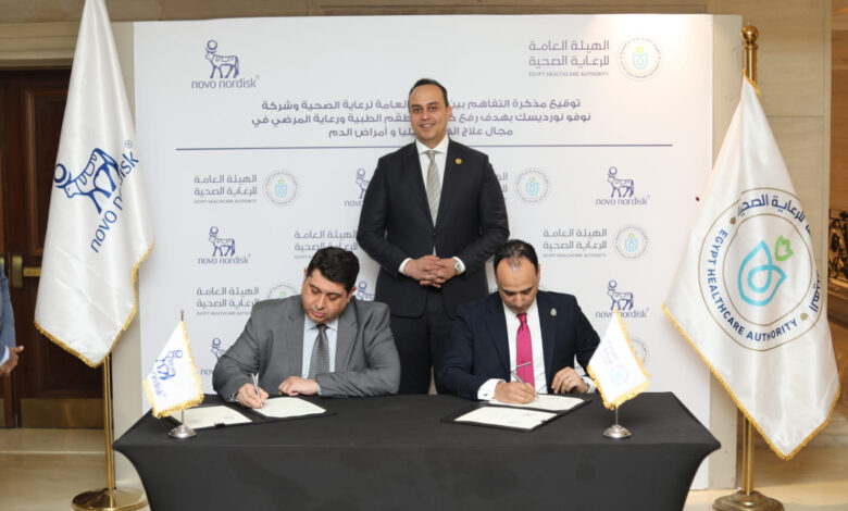 جرت مراسم توقيع مذكرة التفاهم بحضورالأستاذ الدكتور أحمد السبكي، رئيس مجلس إدارة الهيئة العامة للرعاية الصحية والمشرف العام على مشروع التأمين الصحي الشامل، والأستاذ الدكتور أمير التلواني، المدير التنفيذي للهيئة العامة للرعاية الصحية، والدكتور أيمن حسن، نائب الرئيس ورئيس مجلس الإدارة مدير عام شركة نوفو نورديسك مصر وليبيا.